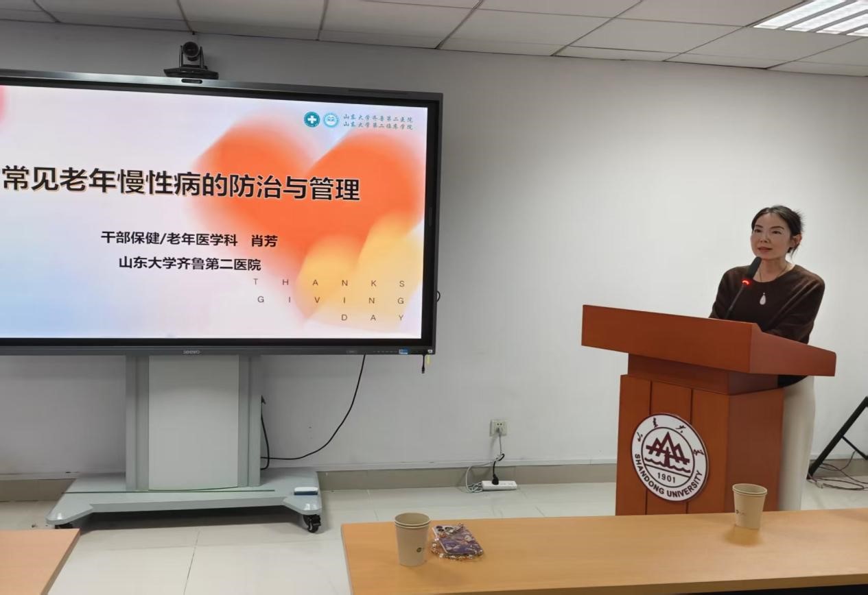 为切实提升老年学员健康素养,助力银龄群体科学预防、规范管理常见慢性病,11月11日,山东大学老年大学康养课堂专属“银龄康养”讲座在中心校区离退休活动中心顺利举行。本次讲座以“健康长寿有妙招:常见老年慢性病的预防与管理”为主题,邀请山东大学齐鲁第二医院老年医学科副主任医师肖芳担任主讲人,为现场老年学员送上了一份实用详实的“健康指南”。
