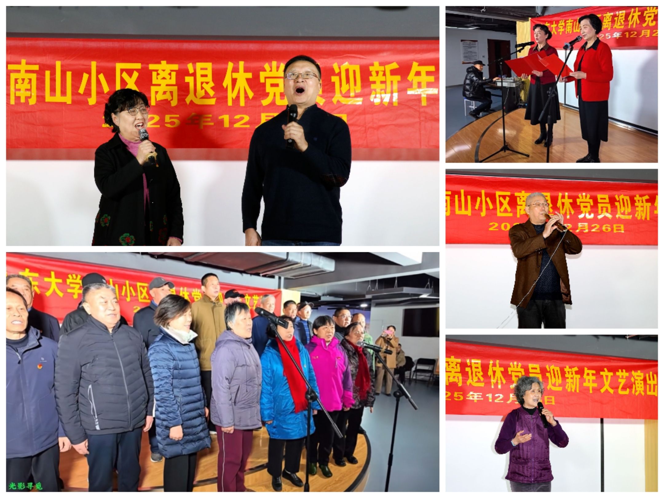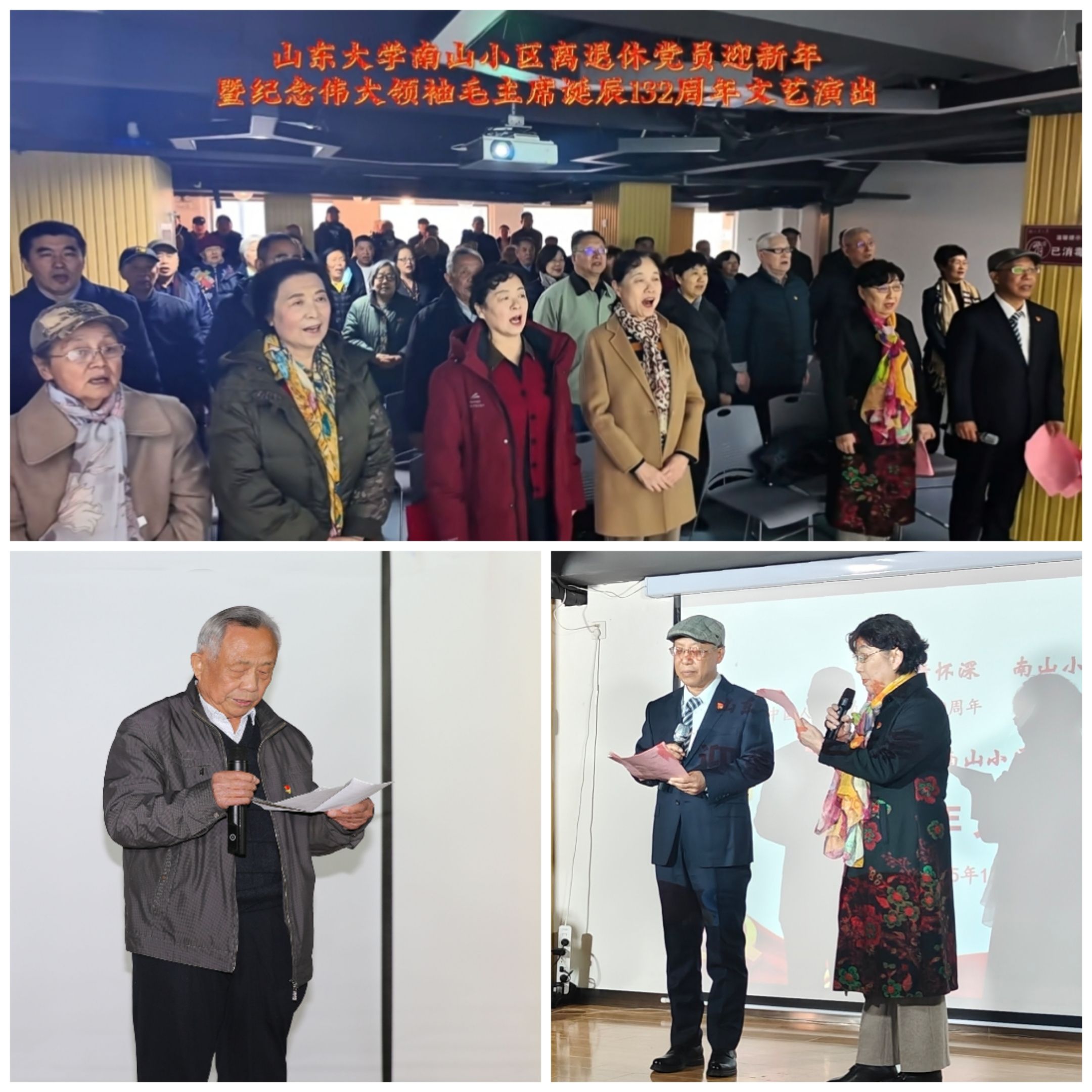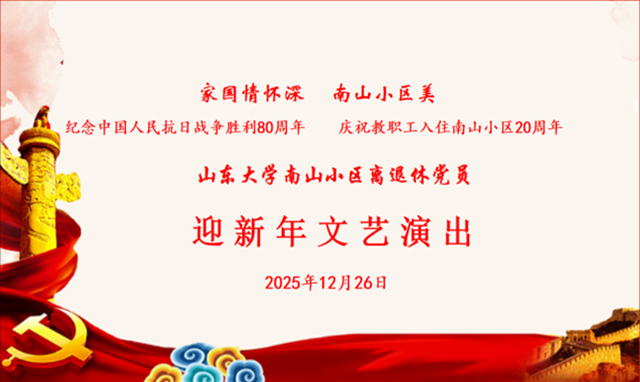 12月26日,以“家国情怀深,南山小区美——纪念中国人民抗日战争胜利80周年、庆祝教职工入住南山小区20周年”为主题的山东大学南山小区离退休党员迎新年文艺演出在兴隆山校区美育文化馆举行,现场笑语欢歌,洋溢着一派热烈、喜庆的气氛。文艺汇演由离退休党委一总支22支部主办,一总支部23支部、二总支21支部、三总支28支部、校医院、兴隆山校区和软件园管理办公室党支部协办,一总支22支部史永志和崔纪新担纲演出主持人,兴隆山校区和软件园管理办公室主任赵龙、校医院院长贾红英、离退休党委副书记关勇等应邀参加活动。