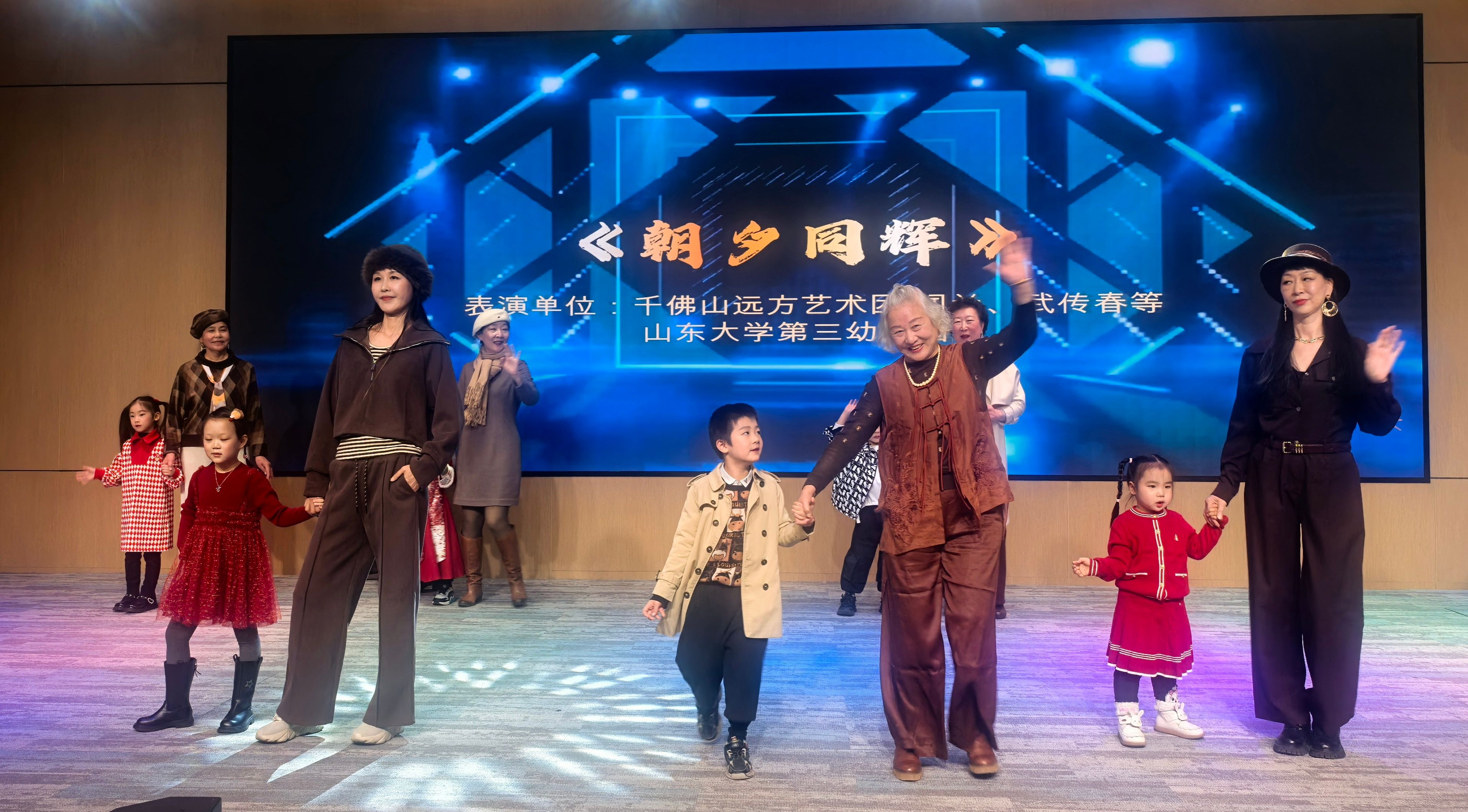 活动尾声,老年大学走秀班与山东大学第三幼儿园联袂带来模特走秀《朝夕同辉》,长者们优雅从容的步伐与孩童们活泼灵动的身姿相映成趣,完美诠释了“老少同乐、共建和谐”的美好意境,为本次活动画上圆满句号。