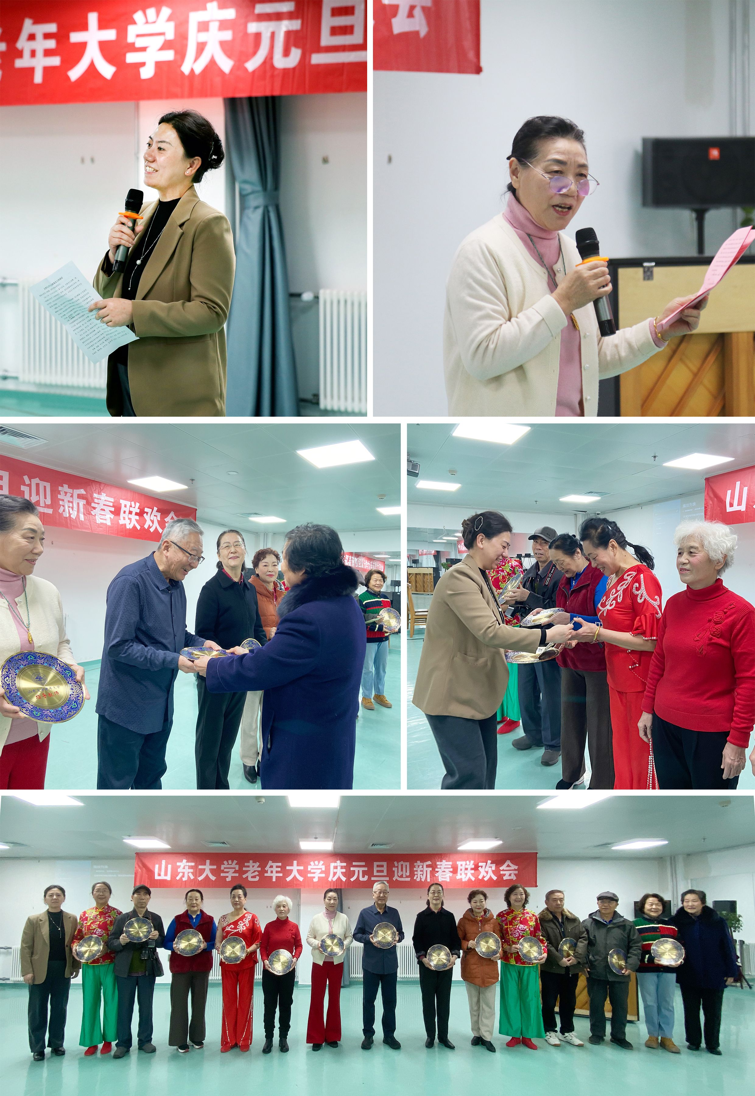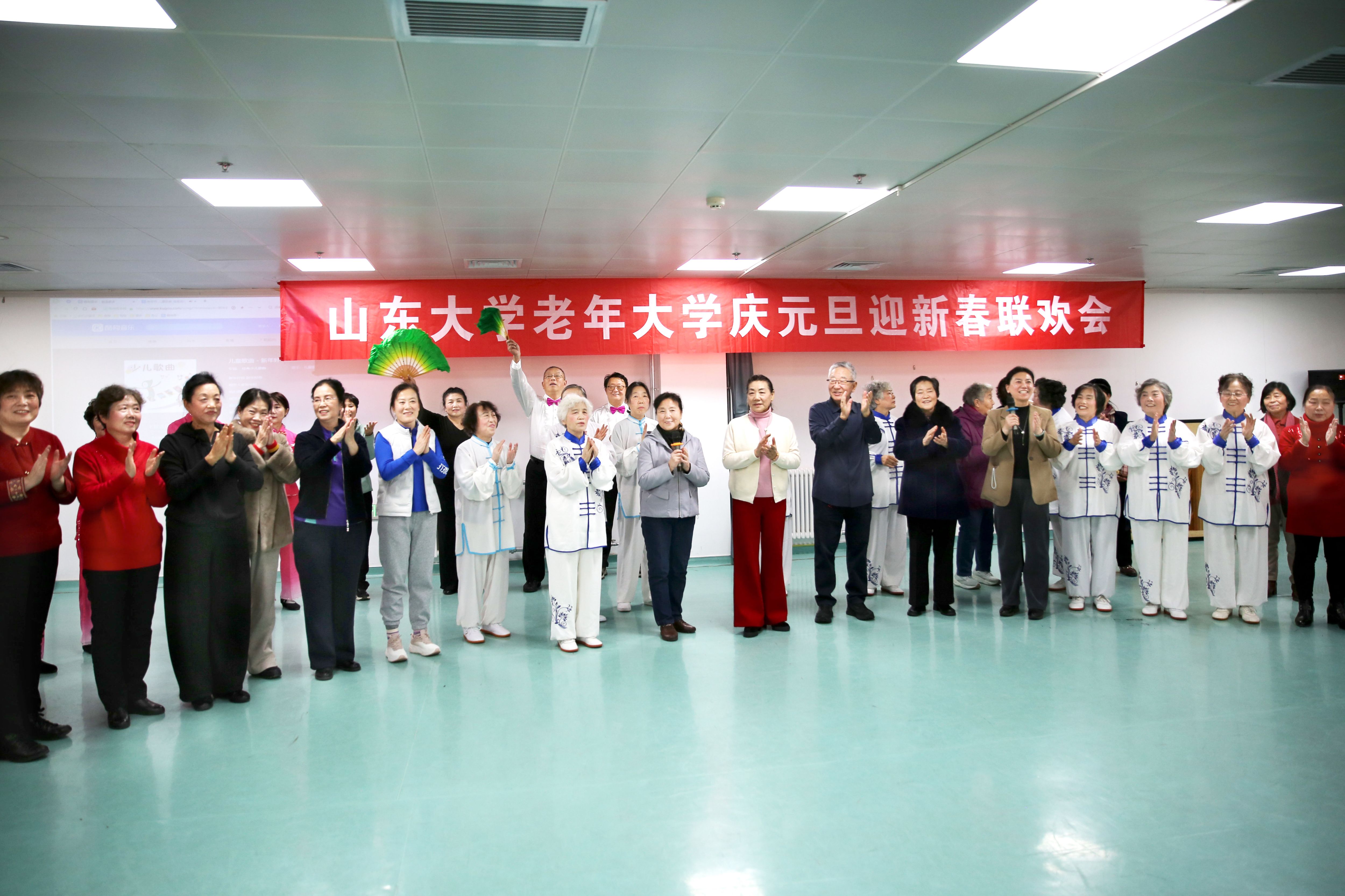 2025年12月30日上午,山东大学老年大学庆元旦迎新春联欢会在趵突泉校区温情举行。老年大学师生、离退休二总支各党支部书记120余人欢聚一堂,以歌舞、朗诵、太极、柔力球、书画等丰富形式共迎元旦佳节,展现出新时代老年人积极乐观、健康向上的精神风貌。联欢会由老年大学各班级精心策划组织,现场节日氛围浓厚,处处洋溢着喜庆与温情。