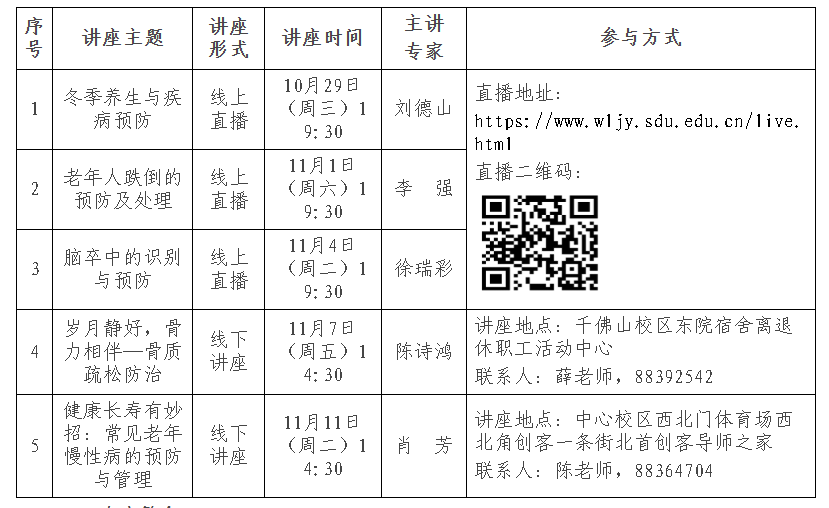 为积极响应全国老龄办等部门关于开展“敬老月”活动的号召,弘扬中华民族孝亲敬老传统美德,促进健康老龄化,服务学习型社会建设,离退休工作处联合继续教育学院在重阳佳节来临之际,特别策划推出“情暖重阳·守护健康”银龄康养系列公益讲座。本次活动汇聚业内知名专家,围绕老年群体健康核心需求,共安排5场专题讲座(线上3场,线下2场),旨在传递科学、实用的康养知识,助力提升老年人健康素养与生活品质。