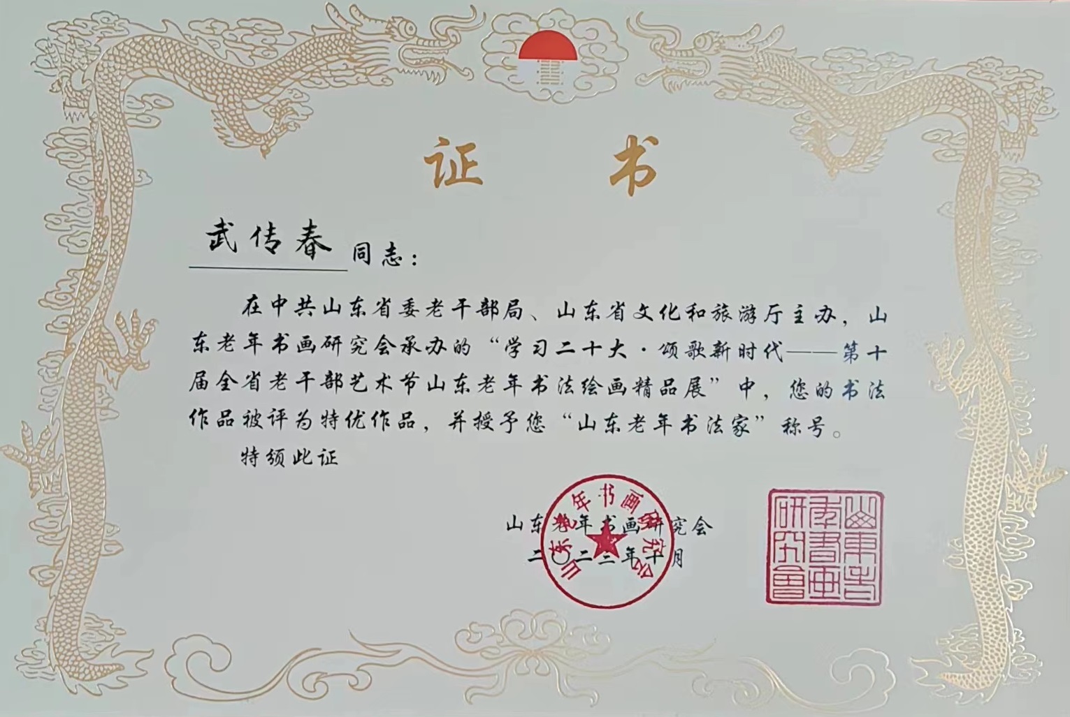 近日,在中共山东省委老干部局、山东省文化和旅游厅主办,山东老年书画研究会承办的“学习党的二十大·颂歌新时代——第十届全省老干部艺术节山东老年书法绘画精品展”中,我校退休教师武传春的书法作品被评为“特优作品”,本人被授予“山东老年书法家”称号。