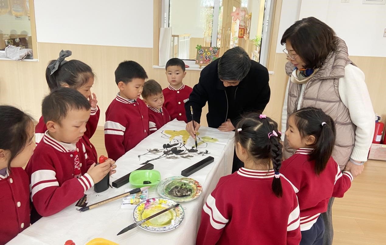 在欢快氛围中,老同志们也轮番登场,各展所长。统一身着练功服的奶奶们,伴随悠扬的音乐,太极扇表演惊艳亮相,她们身姿舒展如流云,手中彩扇开合间,既有“白鹤亮翅”的轻灵飘逸,又有“力劈华山”的刚劲沉稳,将太极刚柔相济的精髓演绎得淋漓尽致。手持柔力球拍的奶奶们手腕轻旋、身姿流转,彩球在球拍上似有生命般灵动翻飞,于迎、引、抛之间划出优美弧线,宛如蝴蝶穿梭花丛,精湛技艺让孩子们惊叹不已。三位退休爷爷现场挥毫泼墨,笔锋流转间,“重阳节”主题书法、毛主席诗词《采桑子・重阳》跃然纸上,寓意“福禄”的葫芦图寥寥数笔便将传统艺术与节日祝福巧妙相融。孩子们好奇地围拢成圈,小脑袋随着笔尖起落轻轻晃动,在清润墨香中悄然感受着传统文化的深邃魅力。