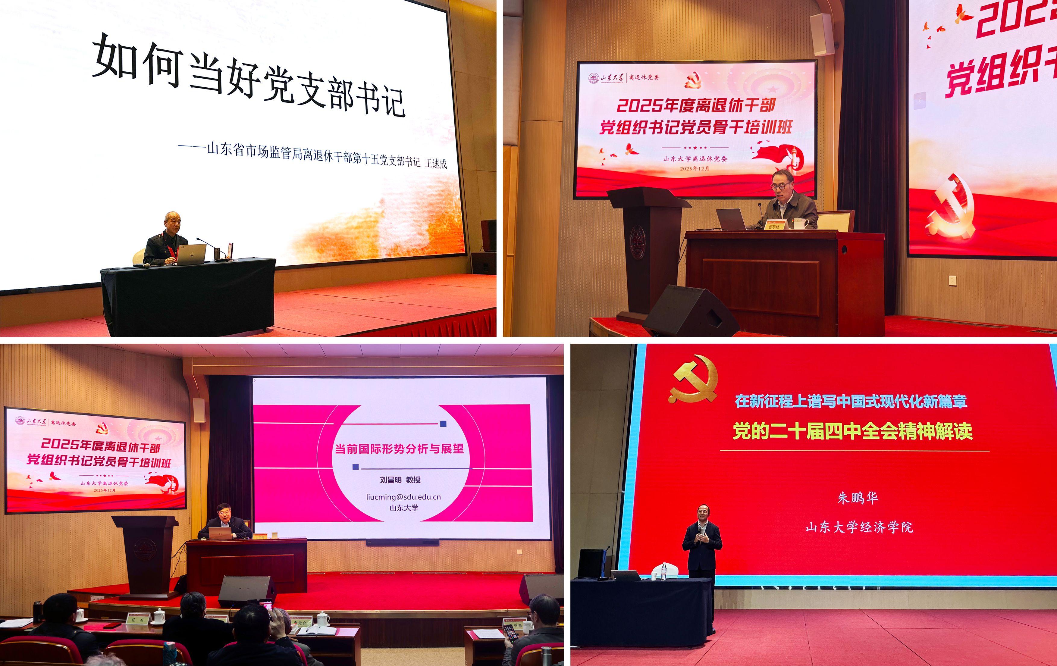 培训班上,全国离退休干部先进个人称号获得者王速成同志,山东大学刘昌明教授、朱鹏华副研究员,分别以“如何当好党支部书记”“当前国际形势分析与展望”“党的二十届四中全会精神解读”为题进行专题授课。郭举修传达了《中共山东大学委员会关于认真做好党的二十届四中全会精神学习宣传贯彻工作的通知》。在经验交流环节,4位优秀党支部书记围绕离退休干部党支部建设、离退休干部党员管理、离退休干部党支部联学共建、引领老同志发挥作用等方面做经验分享。