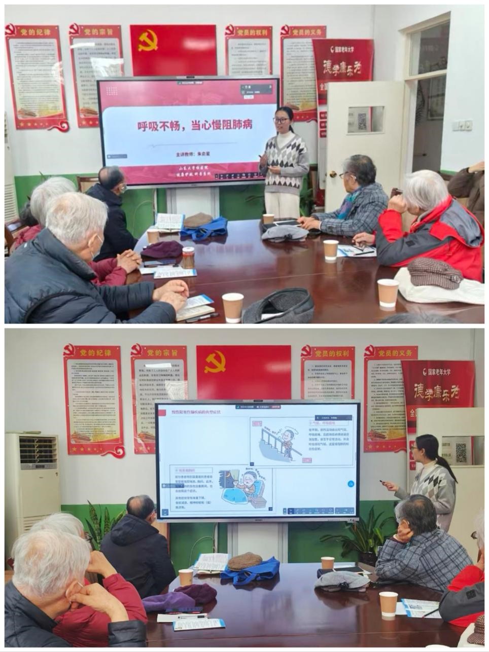 朱俞星结合老年群体身体机能特点,围绕老年常见呼吸道疾病、慢阻肺早期筛查及预防等核心内容,重点分享了实用易行的增强肺功能呼吸小技巧,帮助老同志们科学认识呼吸道健康问题,有效应对呼吸不适。作为本年度康养课堂的收官之课,此次讲座受到了老同志们的一致好评,他们纷纷表示康养课堂精准对接了老年群体的健康需求,在课上学到了许多科学实用的医疗养护方法,内容通俗易懂,让大家深切感受到了来自学校与社区的温情关怀。